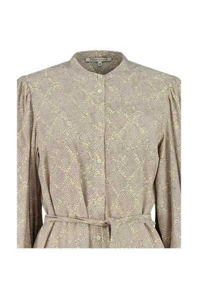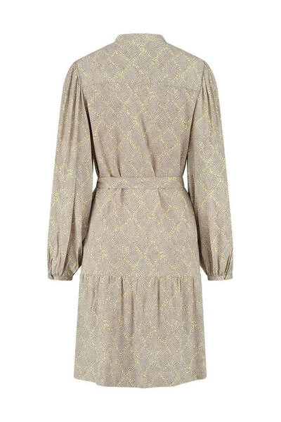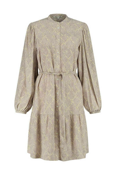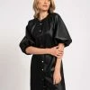 De jurk heeft lange, pofmouwen, is midi lengte, en knopen aan de voorkant.